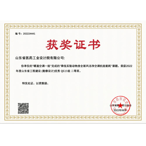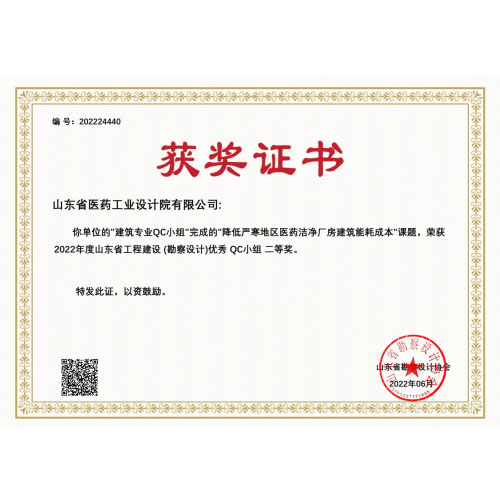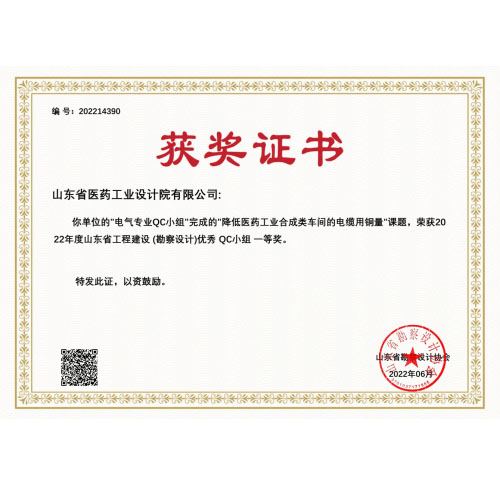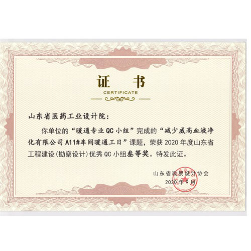 2020年度山東省工程建設(勘察設計)優秀QC小組叁等獎