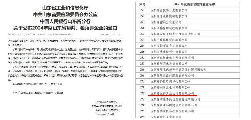 1227日,山東省工業(yè)和信息化廳發(fā)布《關(guān)于公布2024年度山東省瞪羚、獨(dú)角獸企業(yè)的通知》,山東省醫(yī)工院憑借卓越的高成長性、高發(fā)展?jié)摿透呖萍紕?chuàng)新能力,成功獲評2024年度山東省瞪羚企業(yè)。