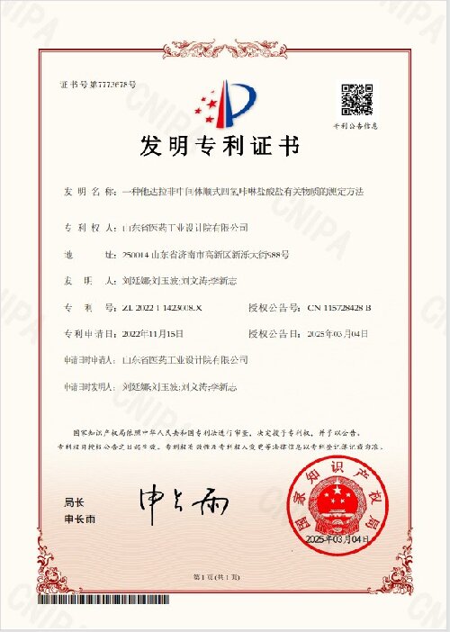 近日,山東省醫工院自主研發的“一種他達拉非中間體順式四氫咔啉鹽酸鹽有關物質的測定方法”獲國家知識產權局發明專利授權。