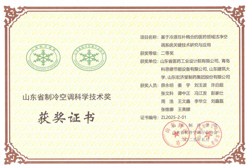 524日,山東制冷學會、山東制冷空調行業協會公布山東省制冷空調科學技術獎評選結果,山東省醫工院《基于冷源互補耦合的醫藥領域潔凈空調系統關鍵技術研究與應用》項目,榮獲山東省制冷空調科學技術獎二等獎。